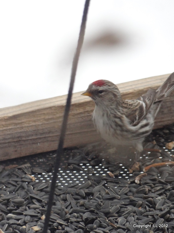 This was a new bird that I had not seen here before. At first I thought they were finches, but no, their streakiness reminded me more of sparrows. Their bills are small and pointed and there is a black spot on the necks. I saw the red spot on the heads of all the birds. Some of the group (the males) have streaks of red on their breasts. They were definitely Redpolls.